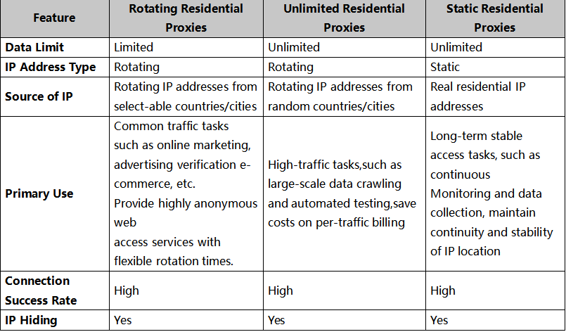 For example, you can use Rotating Residential Proxies for general use and switch to Unlimited Residential Proxies when performing large-scale data collection. For tasks that require long-term stable IPs, Static Residential Proxies can be chosen. This ensures efficiency and protects privacy at the same time.